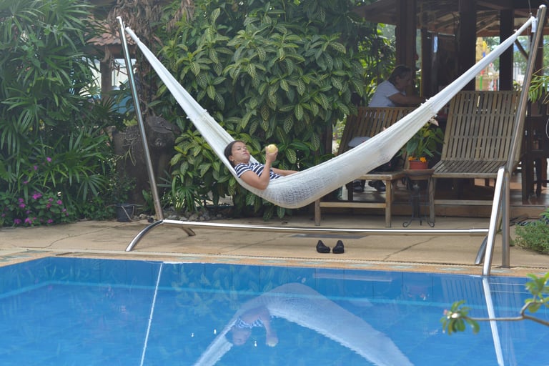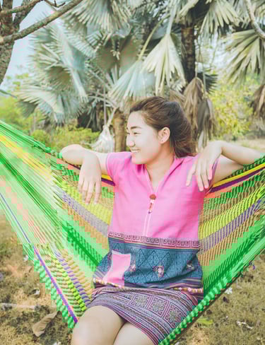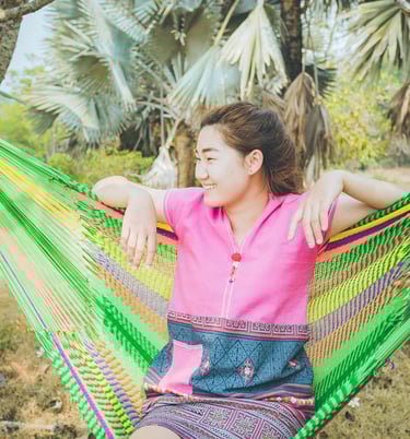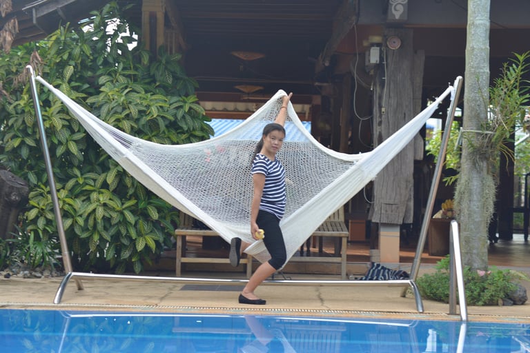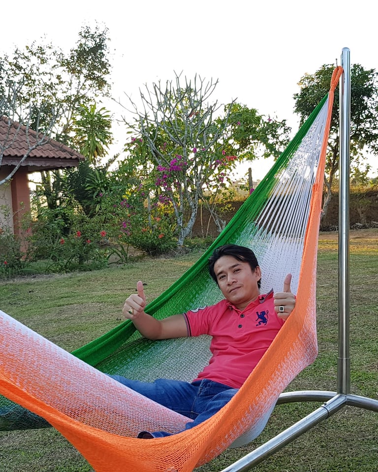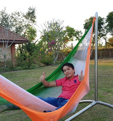This hammock is made for a heavy-duty use, crafted with a blend of nylon and cotton yarn using a specialized weaving technique for maximum strength. Each individual strand is exceptionally sturdy and durable, ensuring long-lasting performance. Designed to resist both rain and sun, it is perfect for outdoor use. Its large size offers ample space, making it incredibly comfortable for a restful sleep and relaxation. These hammocks are hand-woven with care, taking more than four days to complete, and are crafted by the tribal people of northern Thailand, including the Akha, Lahu, and Khmu, as well as skilled artisans from the northern villages.